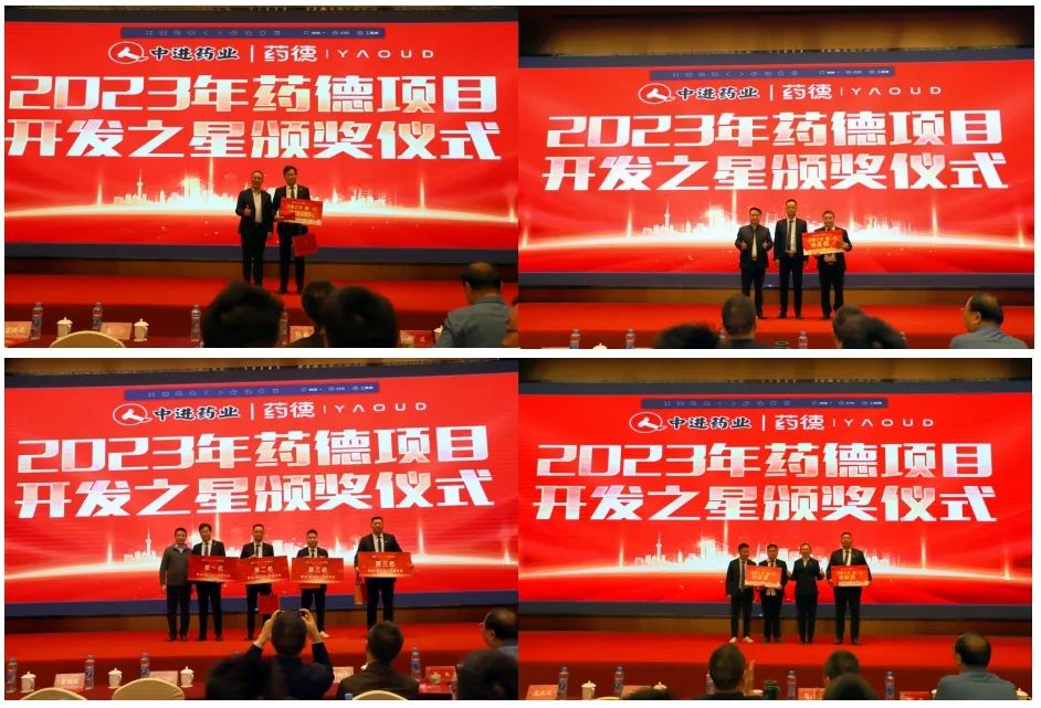 中進(jìn)市場部部長劉永權(quán)宣布《2023年藥德項目開發(fā)之星TOP前三名》,盛邀蘇州華瓴科技有限公司發(fā)展中心總裁盧恩勝、蘇州華瓴科技有限公司發(fā)展中心常務(wù)副總裁孟維君、中進(jìn)人力資源部部長胡耀萍分別為獲得”藥德項目開發(fā)之星”第一名、第二名、并列第三名獲獎省區(qū)頒獎,現(xiàn)場藥德服務(wù)商也為獲獎省區(qū)送上特殊禮品,獲獎的優(yōu)秀省區(qū)代表分別作了熱情洋溢的開發(fā)經(jīng)驗分享。